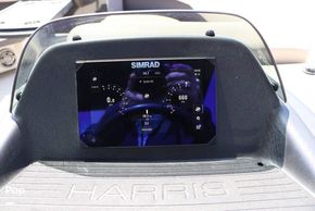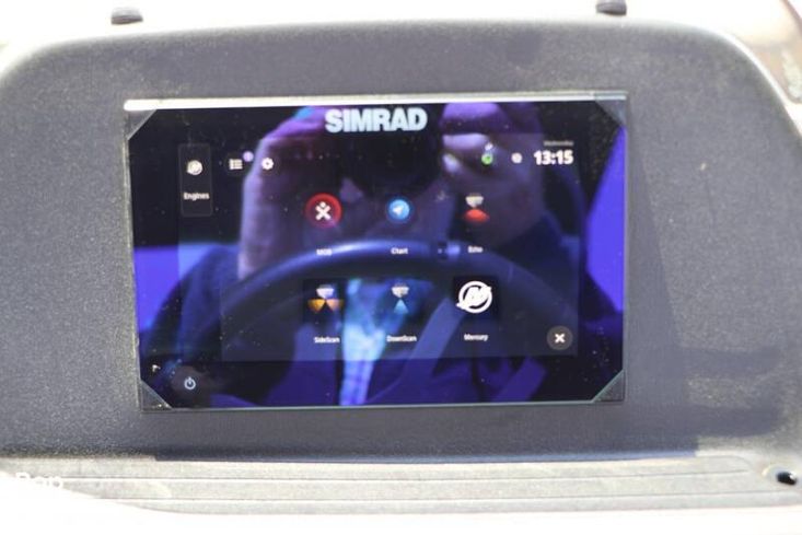 The helm is a masterpiece of ergonomic design, featuring standard five-inch gauges and optional Simrad touchscreen integration that puts total control at your fingertips.