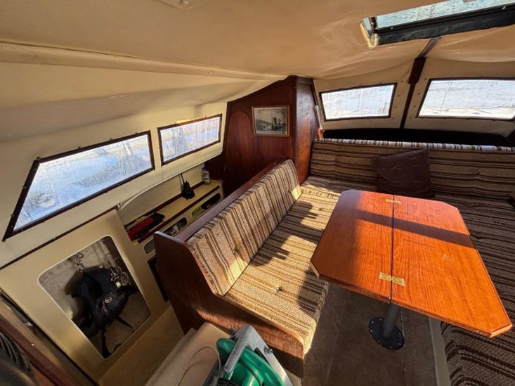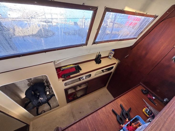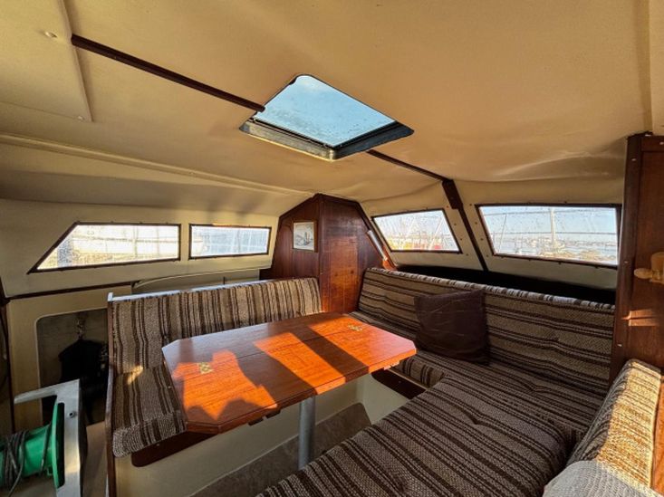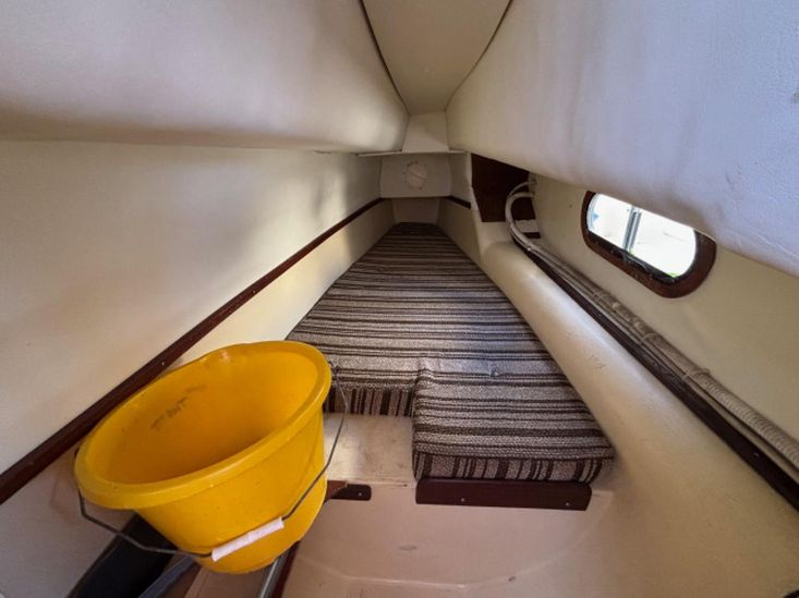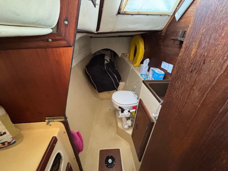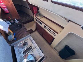 Her galley has a two burner gas cooker with grill. Sink/drainer with manually pumped water supply. 200 litre freshwater capacity in two tanks. Coolbox.