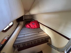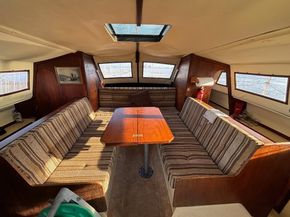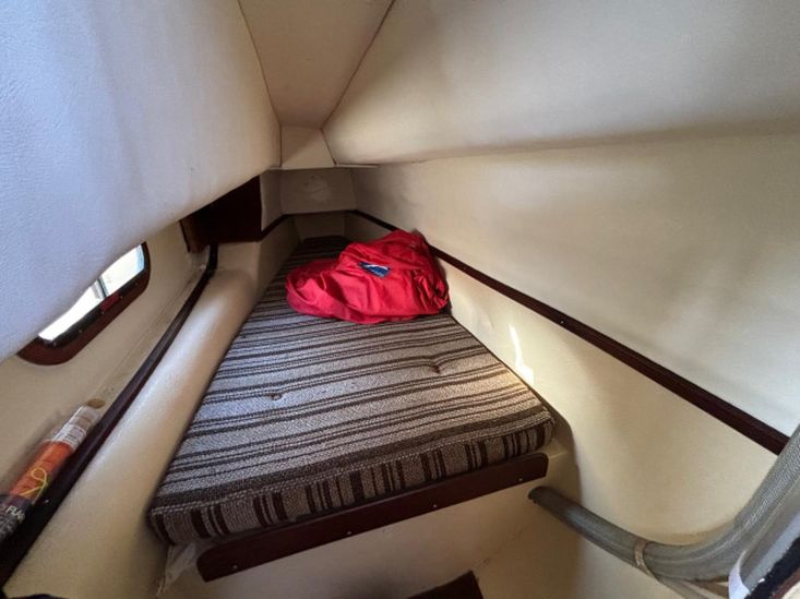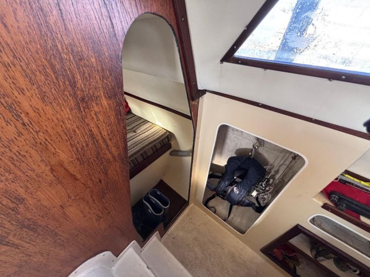 The accommodation offers up to five berths. In the starboard hull, separate heads compartment forward with marine toilet and washbasin. Chart table amidships. Cabin aft with single berth. In saloon, double berth forward. Two settees with saloon table. In starboard hull, single berths fore and aft with galley amidships.