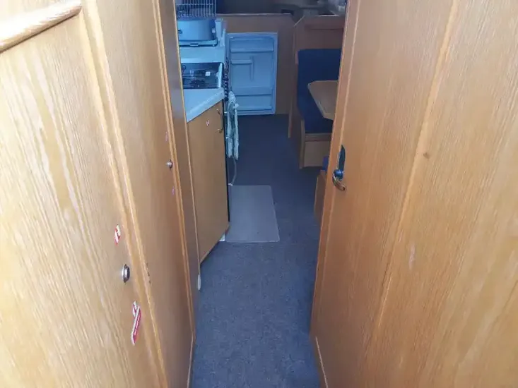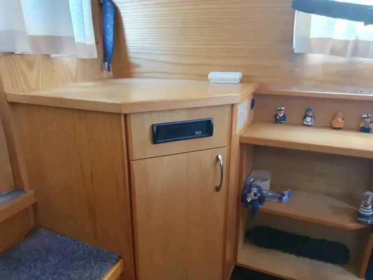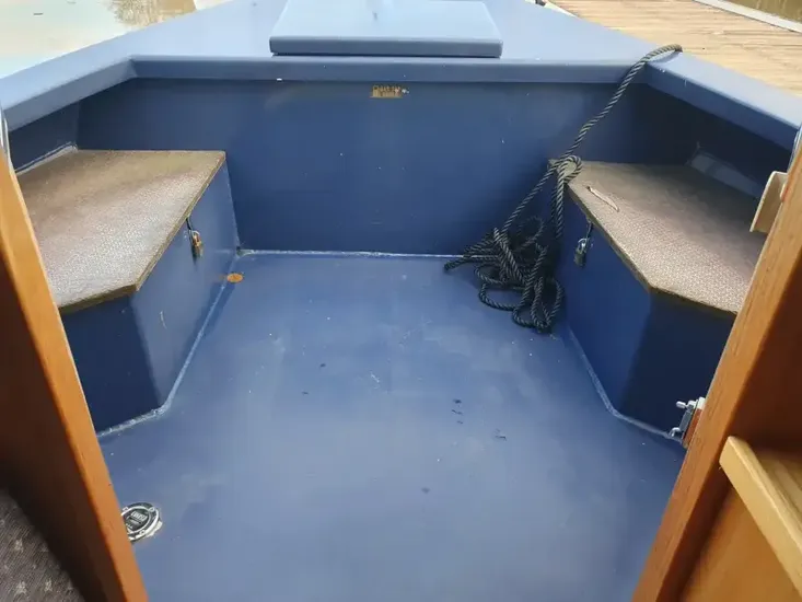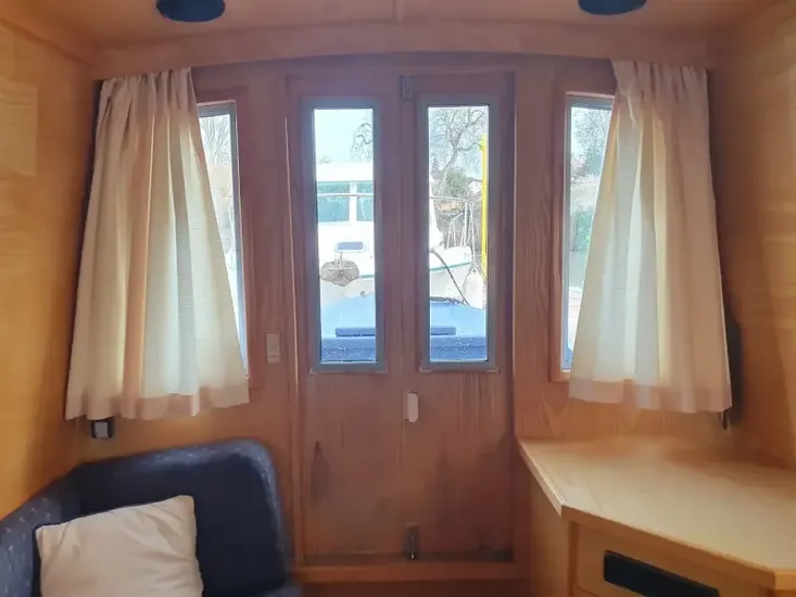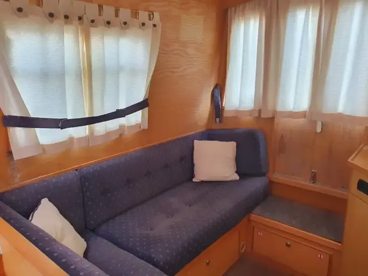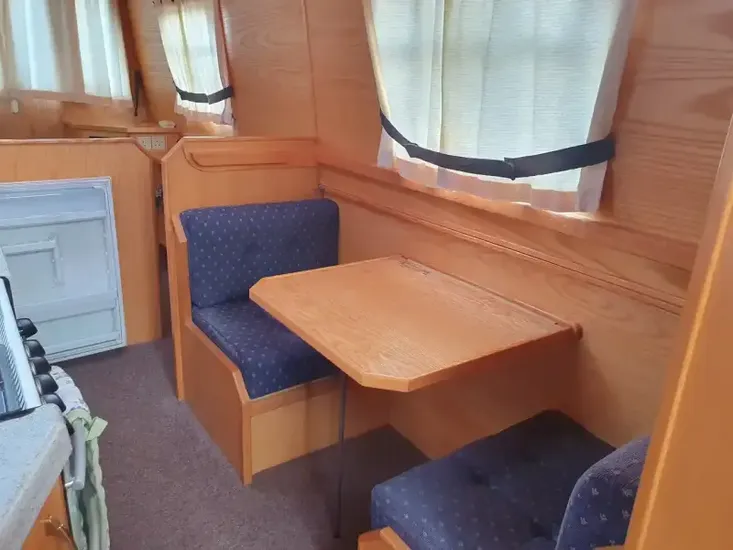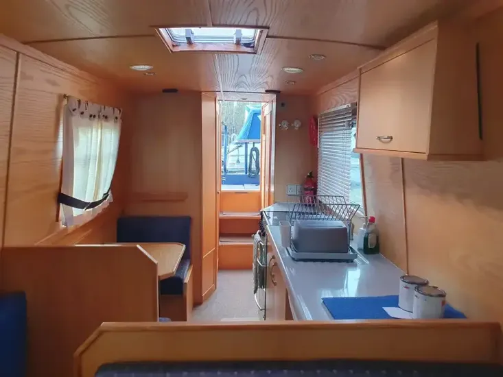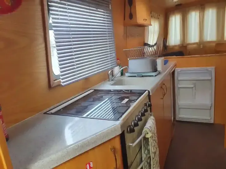 A classic example of the sought after Sea Otter Aluminium Hull narrowboat; African Queen is a wonderful well kept boat still with all its original features. Sea Otters stand apart from the crowd because of their aluminium hulls, making it a low maintenance boat removing the need for blacking or antifouling. African Queen has had one owner since new, and has been well looked after. Her engine is the original Nanni 3.75HE (21hp) diesel engine showing 1,313 hours. From the cruiser stern, you enter down three steps, coming to the heads on your right and large storage and hanging space on your left. Entering the galley, on your left you have a fitted oven with grill and gas hob, built in fridge and a dinette to your right. Moving forward into the seating area, that makes a comfortable double bed, you have cupboard storage and shelving to your right. Plenty of light coming through all windows with the original curtains still fitted. Double doors opening to the bow of the boat, with fitted seating and storage.