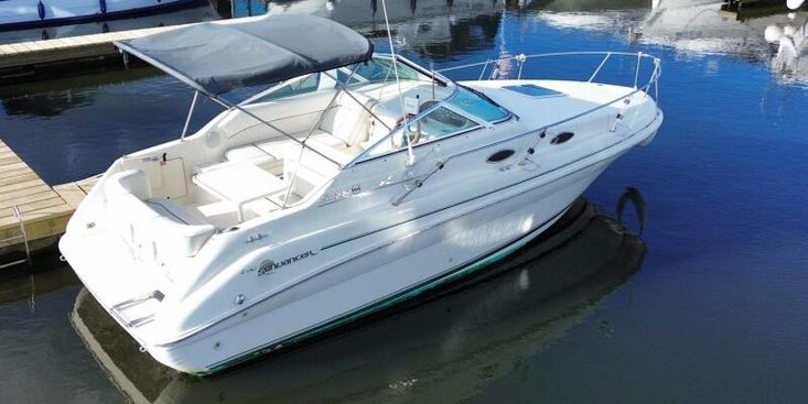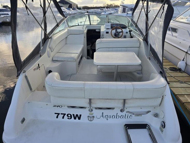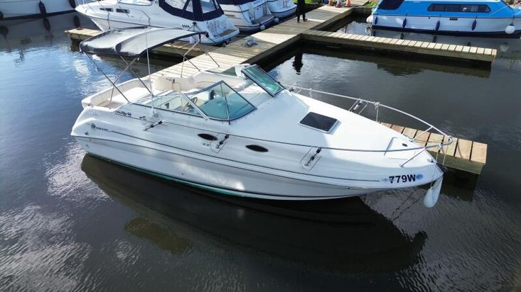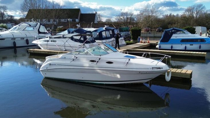 Searay 240 Sundancer - 1999 - Single Mercruiser 5.0EFI 240hp petrol engine through a sterndrive. 4 berth accommodation with a single toilet compartment. Specification to include; bow-thruster, immersion heater, trim tabs, VHF radio, GPS tracker, full canopy. "Aquabatic" boasts a very sociable cockpit, ideal for sharing time on the water with friends and/or family. A low air-draft gives her access under most Broads bridges. A great introduction to boating.